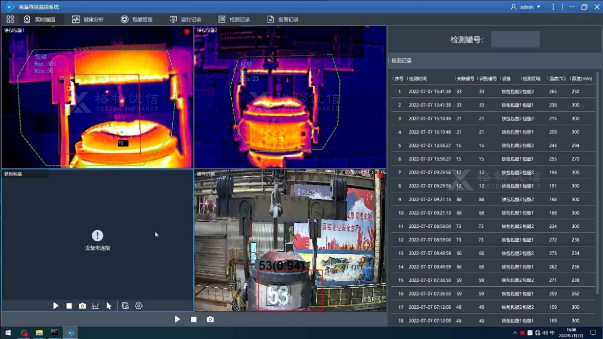 格物優信高溫容器全生命周期管理系統。實現非接觸式多角度測溫,減少人員在高溫生產區域內的駐留,無需人工跟包作業。進行科學預判,預防和減少事故的發生。系統支持罐號與溫度數據檢測關聯,為生產管理和生產調度提供實時的監控數據與科學依據,提升調度管理水平。系統采用先進的射頻識別技術、紅外圖像算法、AI視覺算法、大數據分析等技術,實現煉鋼工序生產組織和調度管理數字化水平,為建設數字化鋼廠提供技術支撐。同時完備的臺賬記錄,包括包罐的使用次數、維修、烘烤記錄、使用時間等,避免高溫容器使用頻次不均,影響包罐使用壽命,增加使用成本。提高工人的檢修效率。